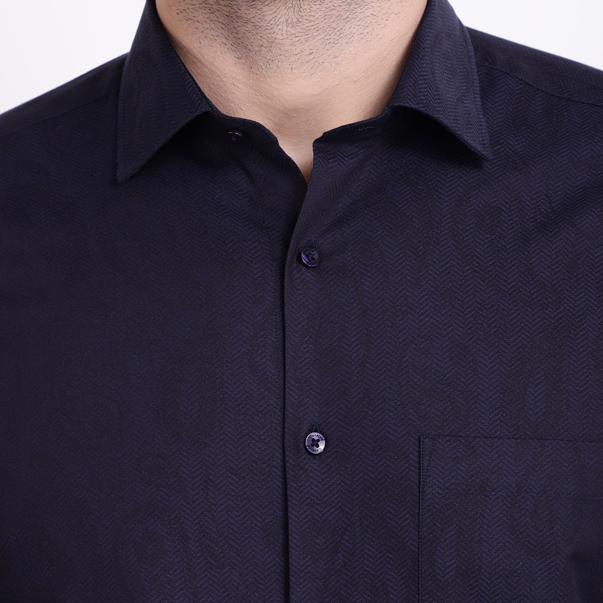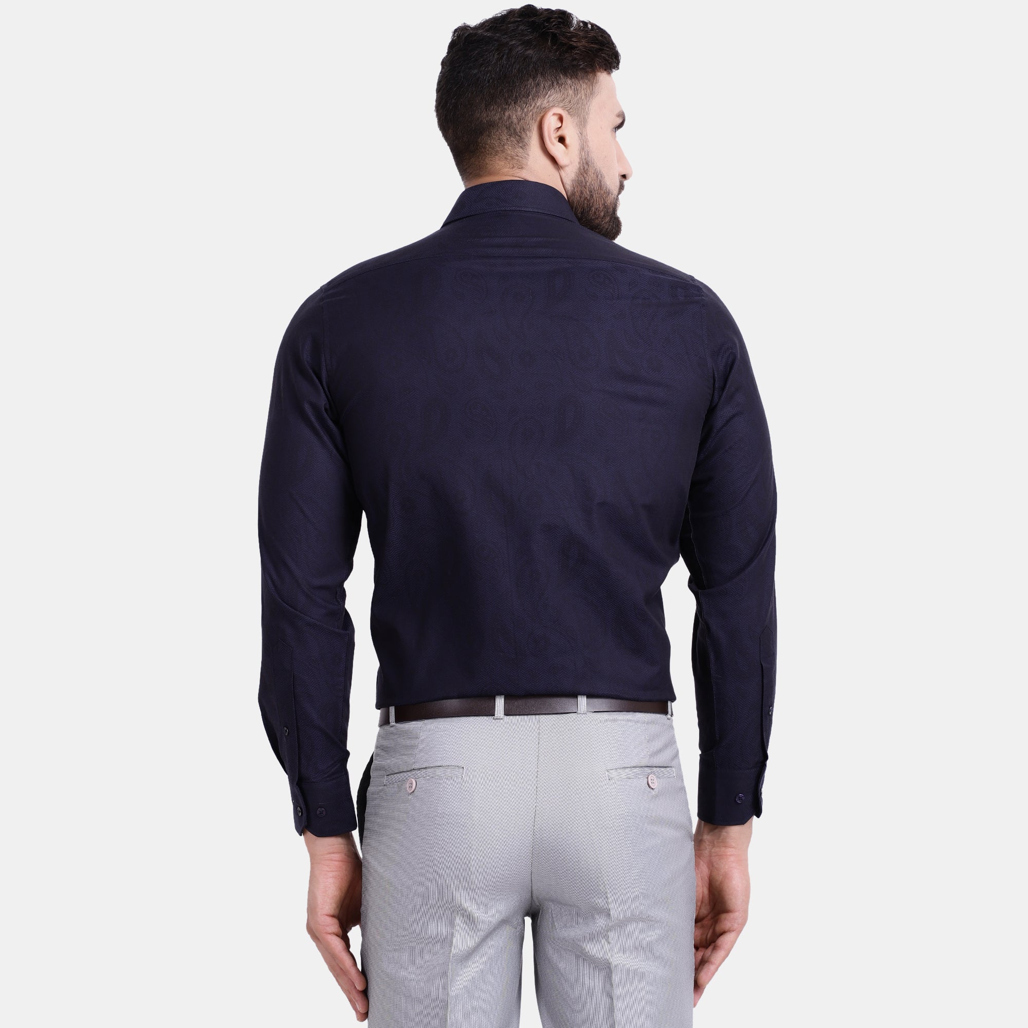 Evening wear casual dress shirt having subtle all over herringbonetextured with paisley motif jacquard design with hipster collar and single convertible cuff, having lustre because of its satin weave, after that this product is a Pima mercerized which results a higher lustre and soft hand touch, embroidery at yoke part is additional comfort and provides itchy free neck